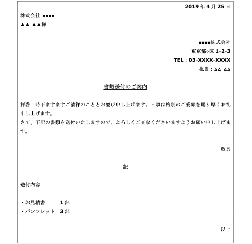 実際に送付する内容物を記と以上の間に記載します。必ず箇条書きで、以下の例のように書類名と数量を記載してください。