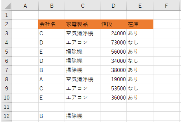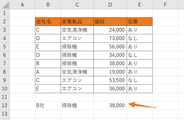 例)以下をご覧ください。A,B,C,D,Eの5つの会社があり、それぞれの会社が販売している家電製品とその価格が書かれた表があります。この中から、B社が販売している掃除機の値段を知りたいとします。