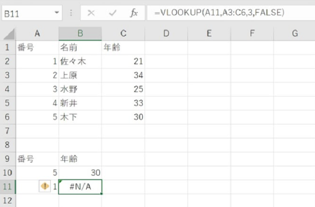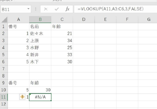 以下をご覧ください。番号が1~5番までの人の名前と、その年齢が書いてある表があります。この中から、5番と1番の人の名前を探したいとします。