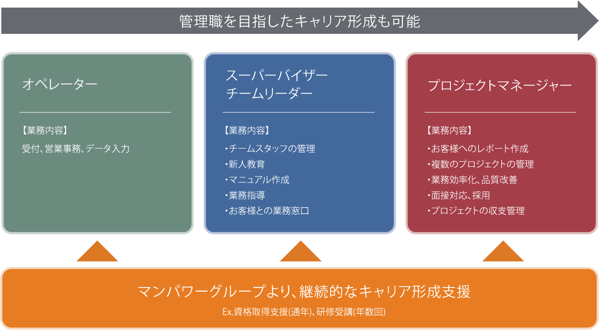 「オペレーター」や「スーパーバイザー」など、各ポジションにあわせてキャリアを形成することが可能です。